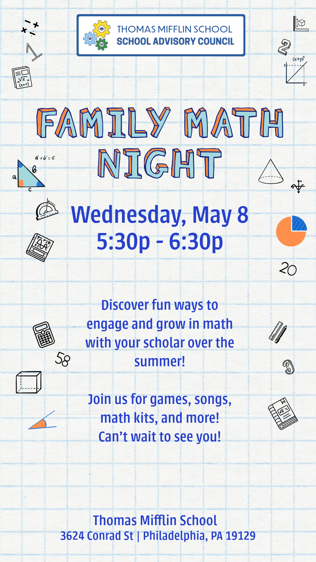 SPECIAL EVENT: Family Math Night, 5:30p - 6:30p Wednesday, May 8, 2024 5:30 PM 6:30 PM 17:30 18:30 Google Calendar ICS RSVP HERE!
