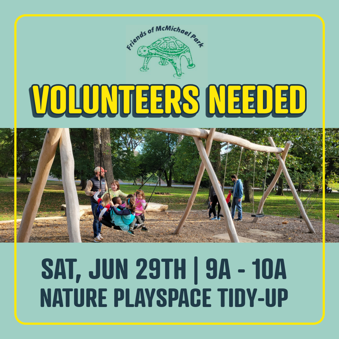 Join the Friends of McMichael Park for ONE hour on Saturday morning to help mulch the Nature Playspace to help protect our kiddos from those inevitable tumbles!