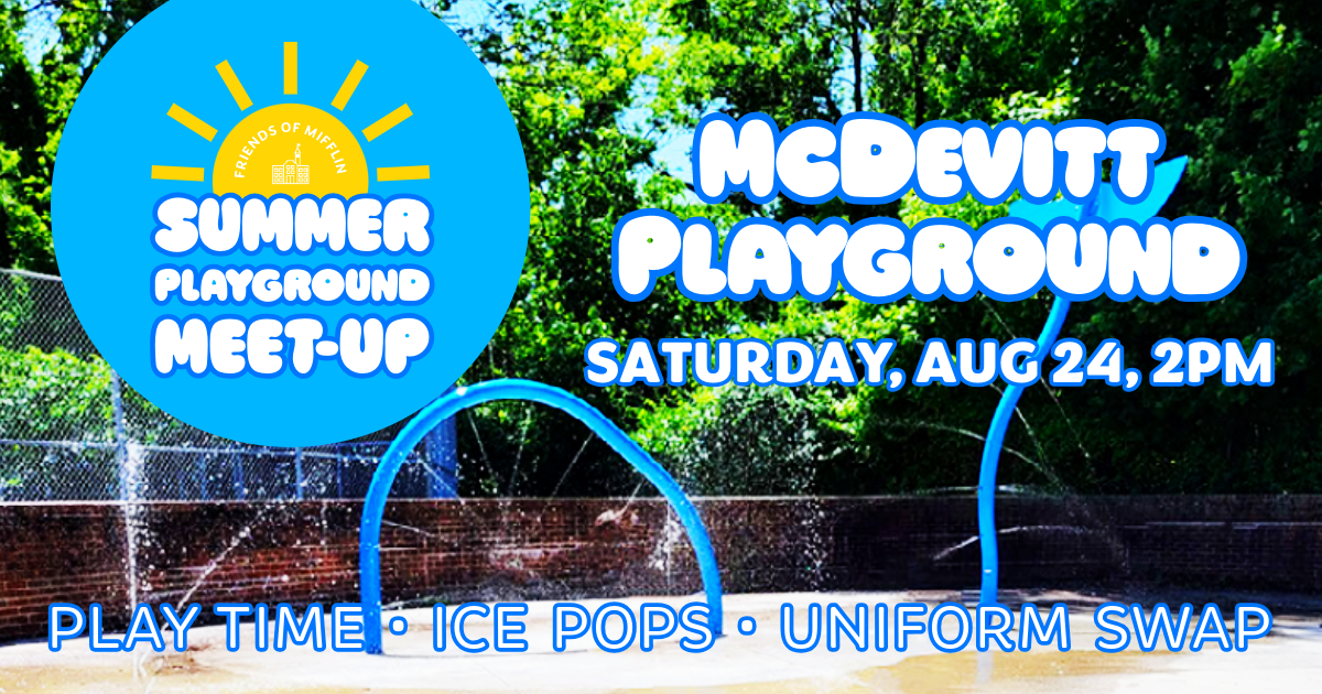 The final Summer Playground Meet-Up will be at McDevitt Playground on August 24, 2pm! Kids can enjoy an afternoon of fun and sun and ice pops! Mifflin students can swap out old uniforms for new-to-them uniforms for a more sustainable 2024-2025 school year!